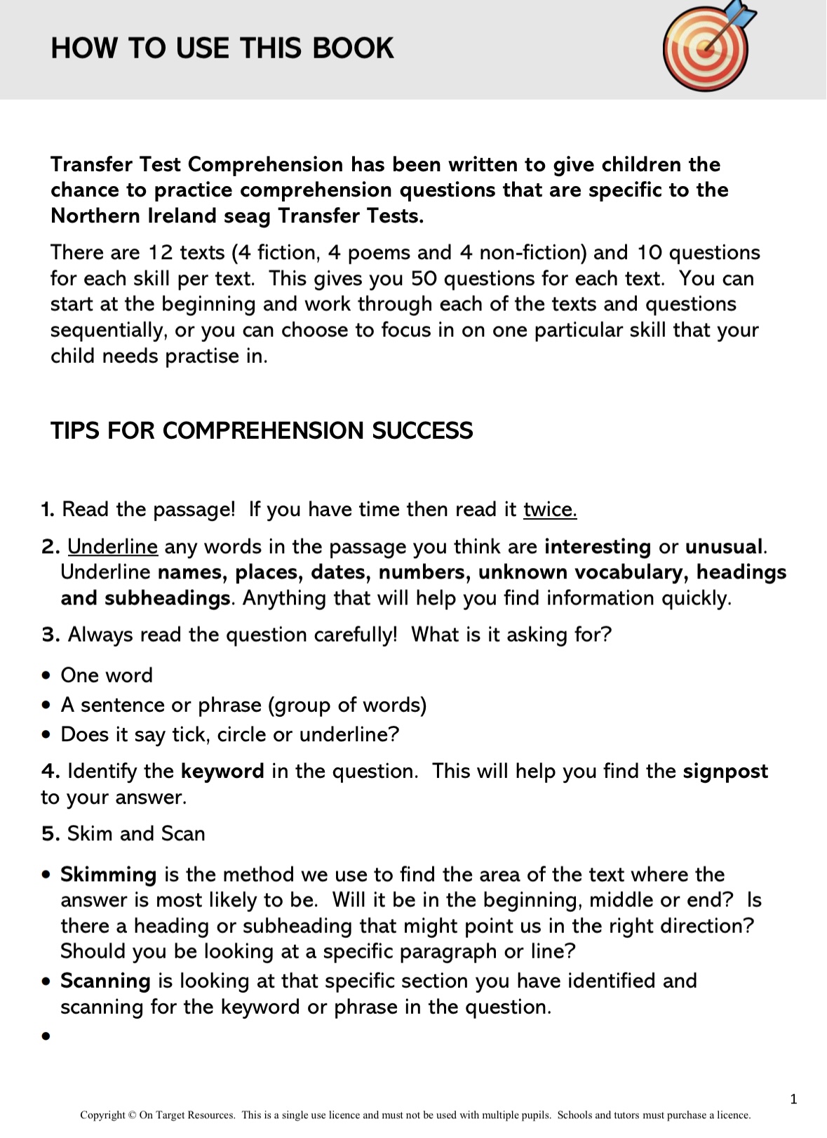 - 5 Transfer Test Skills covered: True, False, Don’t Know; Multiple Choice; Words with similar meaning; Word or phrase search; Nouns, Verbs, Adjectives and Adverbs.